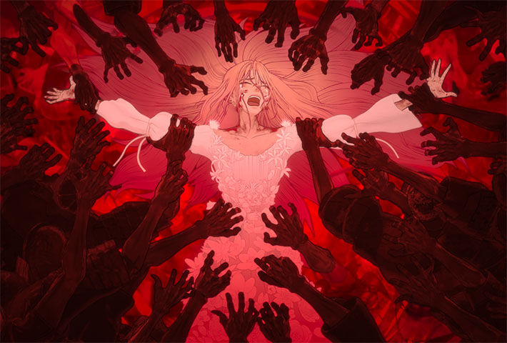 No es casual, de hecho, que en la búsqueda por parte de su protagonista, Scarlet (voz original de Mana Ashida), de su traicionero tío Claudius (voz original de Koji Yakusho), Hosoda vaya transformando, de forma equivalente al propio relato, la orografía de su versión del purgatorio. De ahí que lo que comienza como un espacio postapocalíptico, diríase que salido de uno de los herederos y/o imitadores de la franquicia Mad Max, se vaya transformando en un escenario de guerra cada vez más oscuro y más grisáceo.